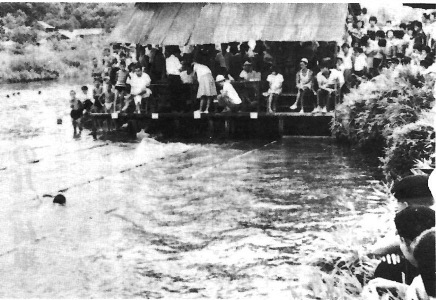 場所は中深川で、写真の左側対岸は右岸の院内集落。これより百メートルほど川下に院内橋がある。左岸の少し川に突き出した地点を利用して、その懐の川底に木柱を埋め込み、その上に横木を並べて床を造った。されにこの画面内ではないが川下25メートルの位置にやはり柱を数本打ち込んでターンの箇所を造っている。川と言ってもこの場所では流れは川の中程より右岸の方に寄っていて、左岸の側は常の水量の際はあまり流れの影響を受けない場所であった。コースを5つとって、試合に使うのは一番岸よりは除いた4コースを用いた。当時のこの学校はたいてい毎年4学級の生徒数なので、クラス対抗リレーなどには適当な大きさだった。写真は校内水泳大会の時の撮影と思われ、周囲は満員で手前の側にも応援生徒の頭が見える。