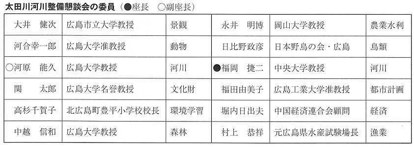 今回の懇談会が終了すると、太田川河川事務所は今まで得られた各委員の意見を元に、太田川の整備に関する「対処方針」を設定。その内容説明を広島県・広島市・安芸高田市の各首長へ行ったのち、「太田川河川整備計画」原案が作成されます。今回の傍聴者は、我々取材者を含め30名ほど。議題は、太田川の利水・環境・維持管理・流域、各項目の目標および対処方針でした。事務局が作成した資料を元に説明が行われ、その後、委員による意見交換がなされました。意見交換の内容を中心に、主なポイントをご紹介します。 (岩本)